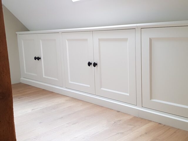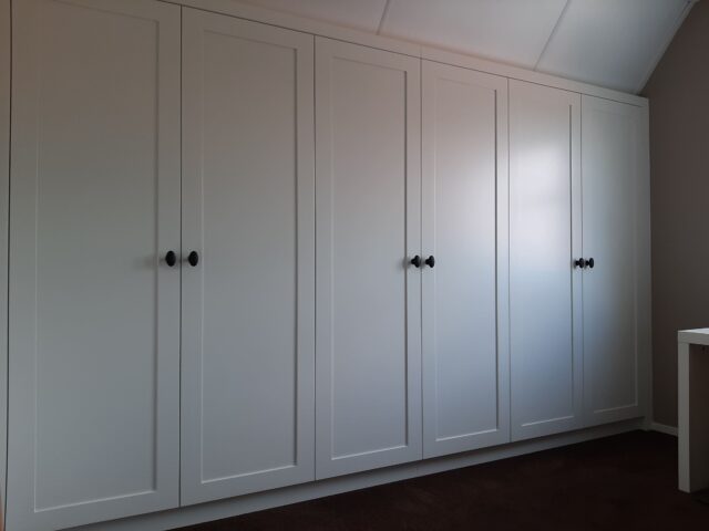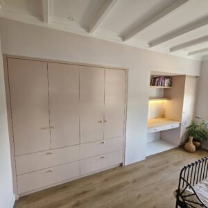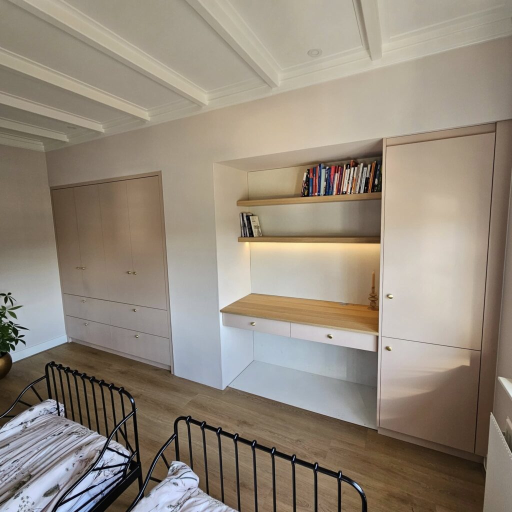 Twee bestaande nisje voorzien van kledingkast en maatwerk bureau. De strakke lijnen en de zachte roze kleur maakt deze klus te een geslaagde opdracht. De messing knopjes matchen erg goed en maken het tot een mooi geheel.