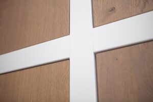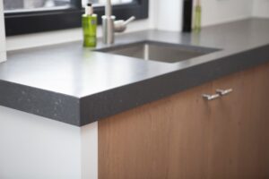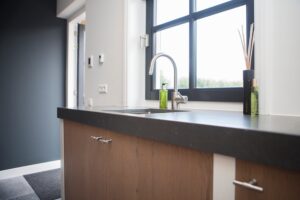 Luxe hardstenen werkblad en rustiek eiken kastdeuren.