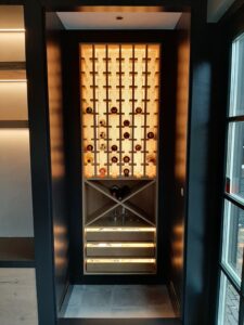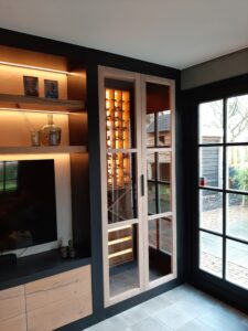 Ruimte voor een grote tv en het opbergen van hobby wijnen.